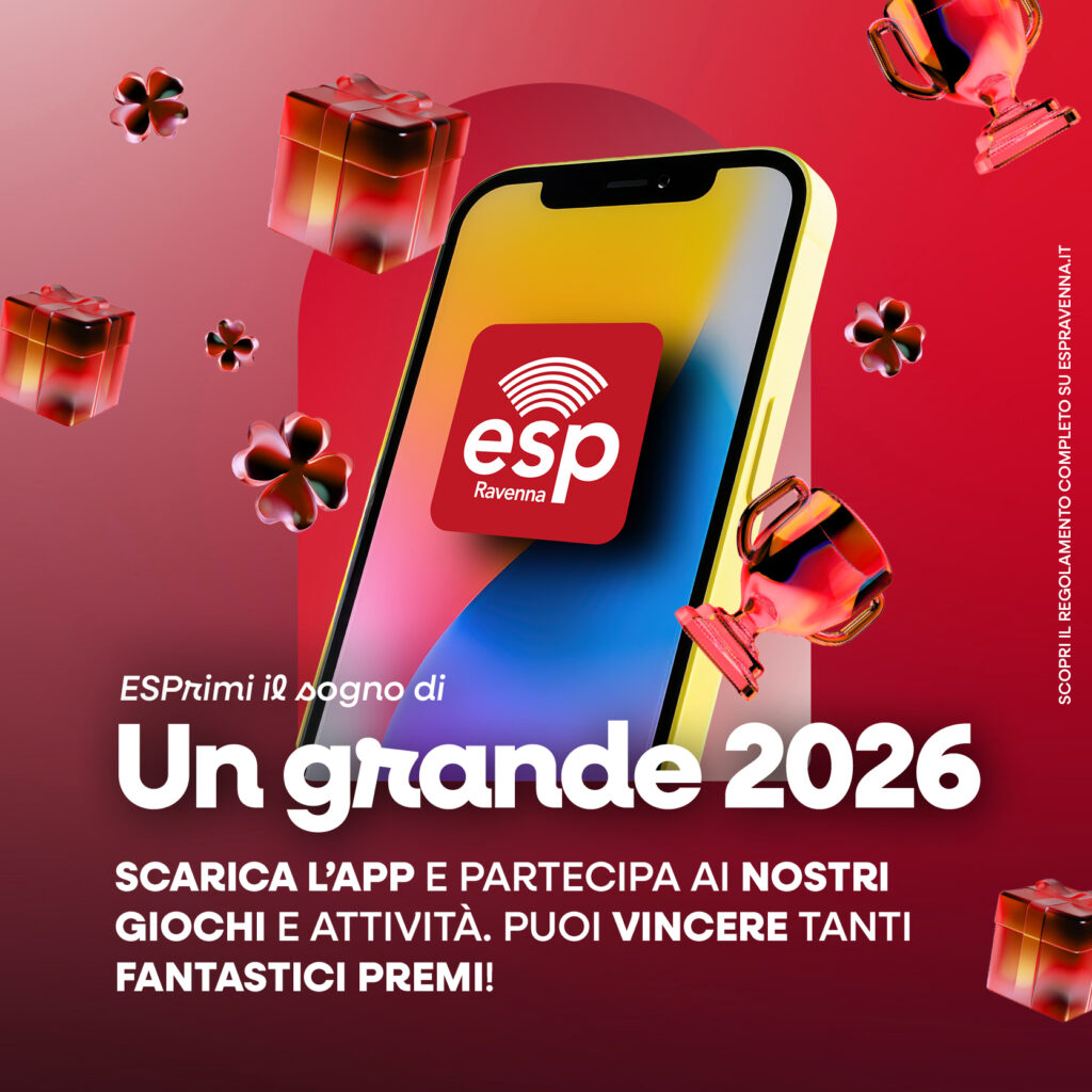 ESPrimi il sogno di un grande 2026! Con l’App ESP Ravenna vivi un’esperienza ancora più coinvolgente: giochi, attività speciali e tante occasioni per vincere fantastici premi. Scarica l’app, partecipa alle iniziative e rendi il tuo 2026 ancora più speciale.👉 Scopri il regolamento QUI SCARICA ORA Condividi